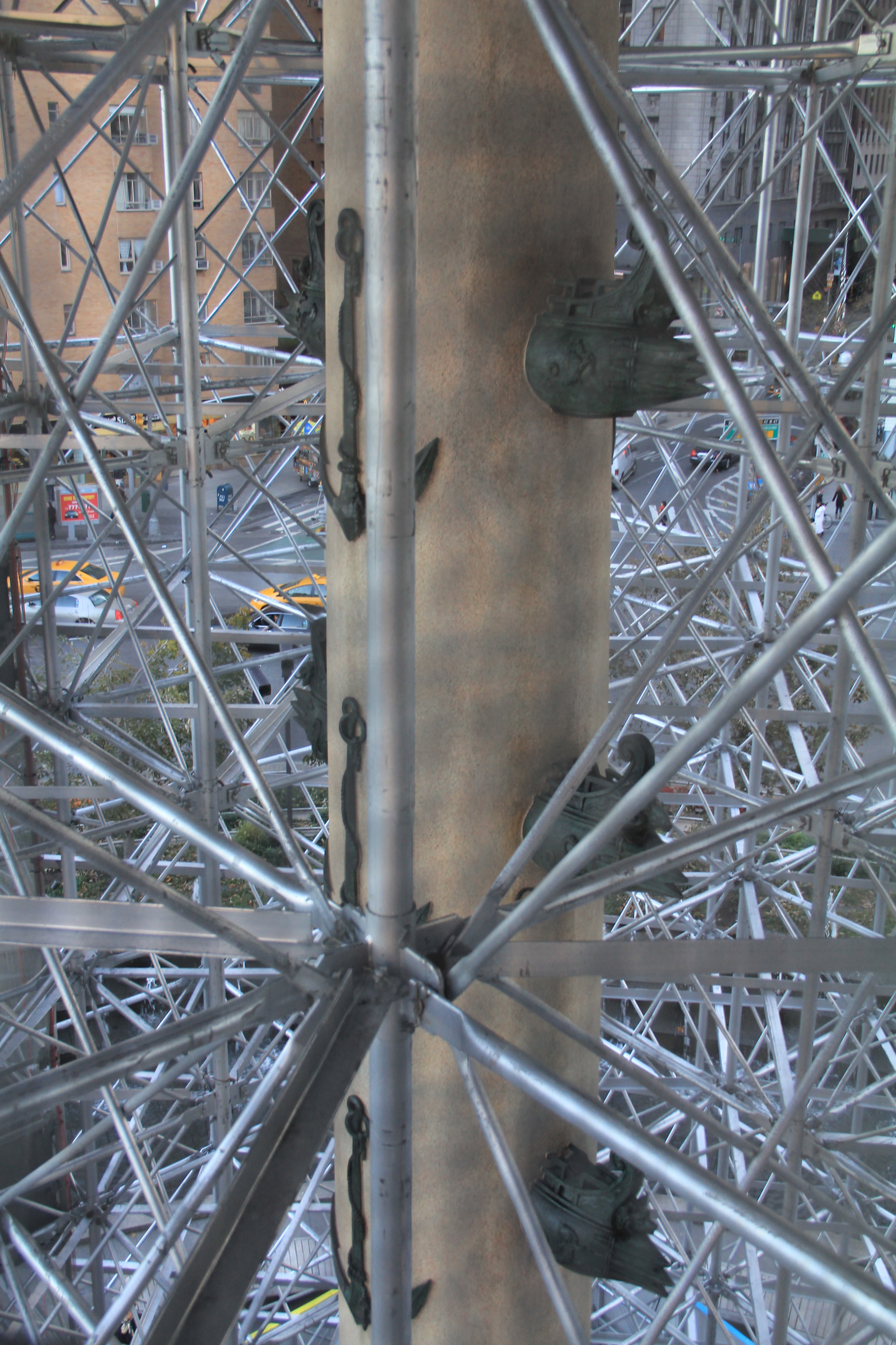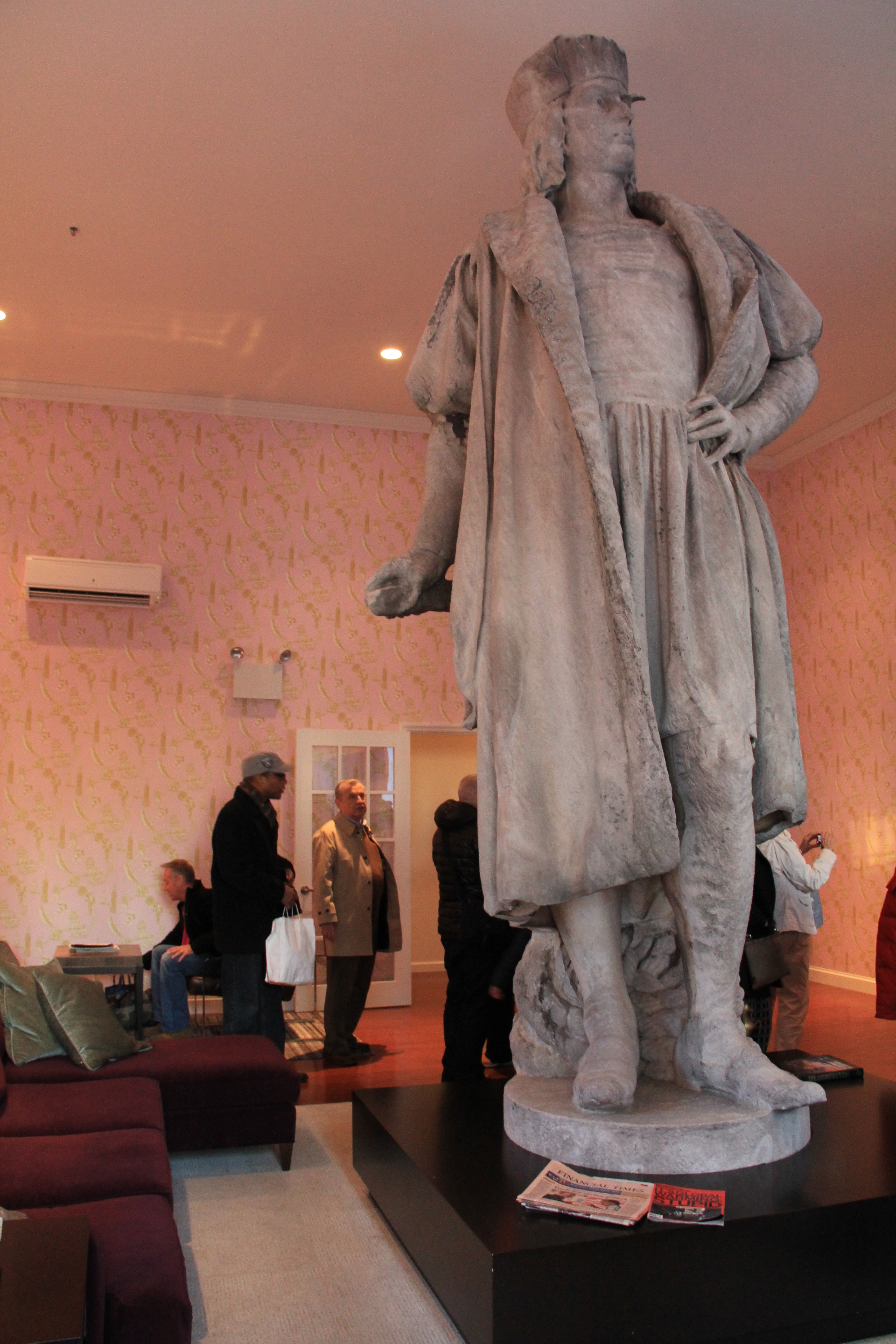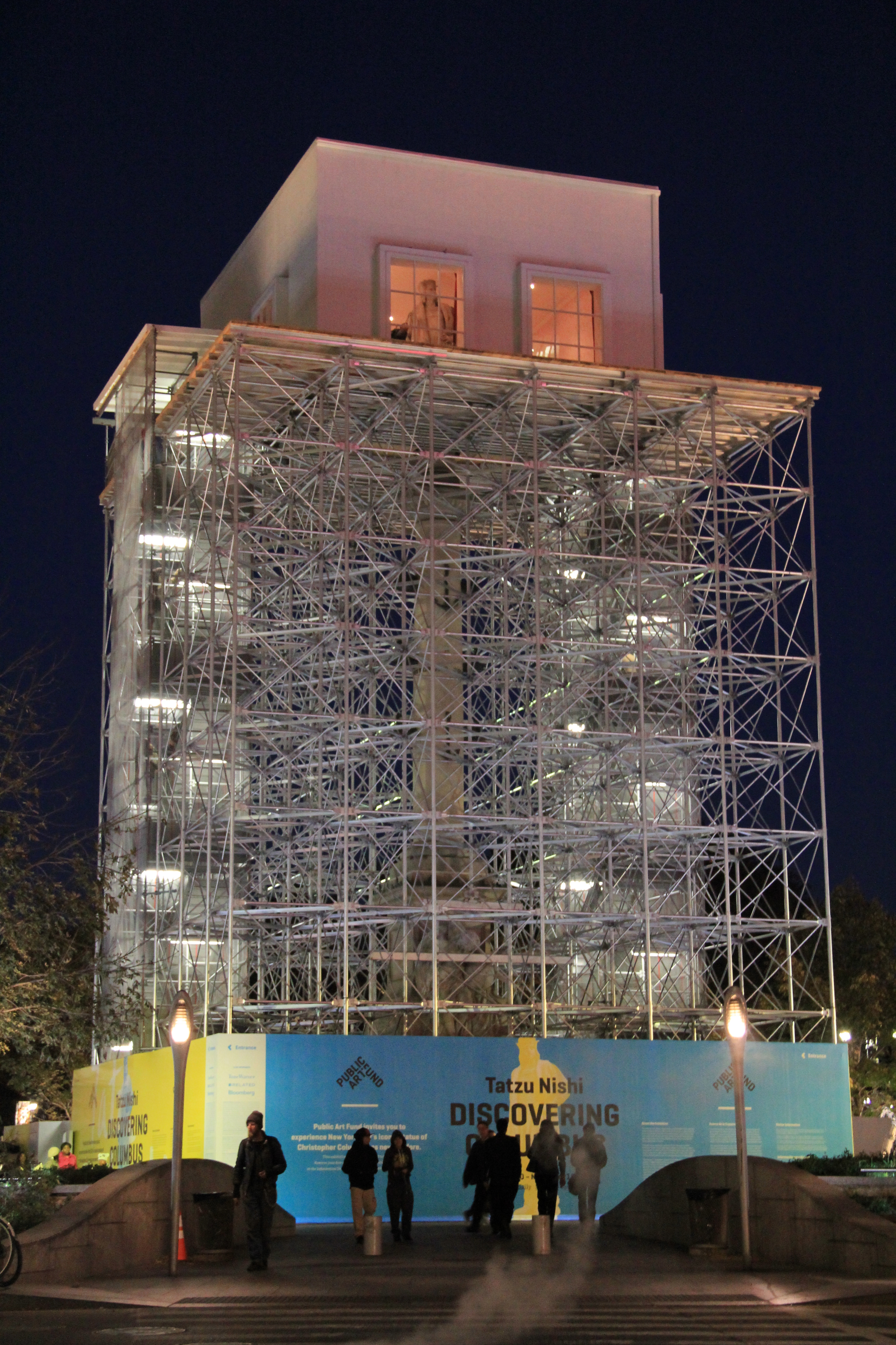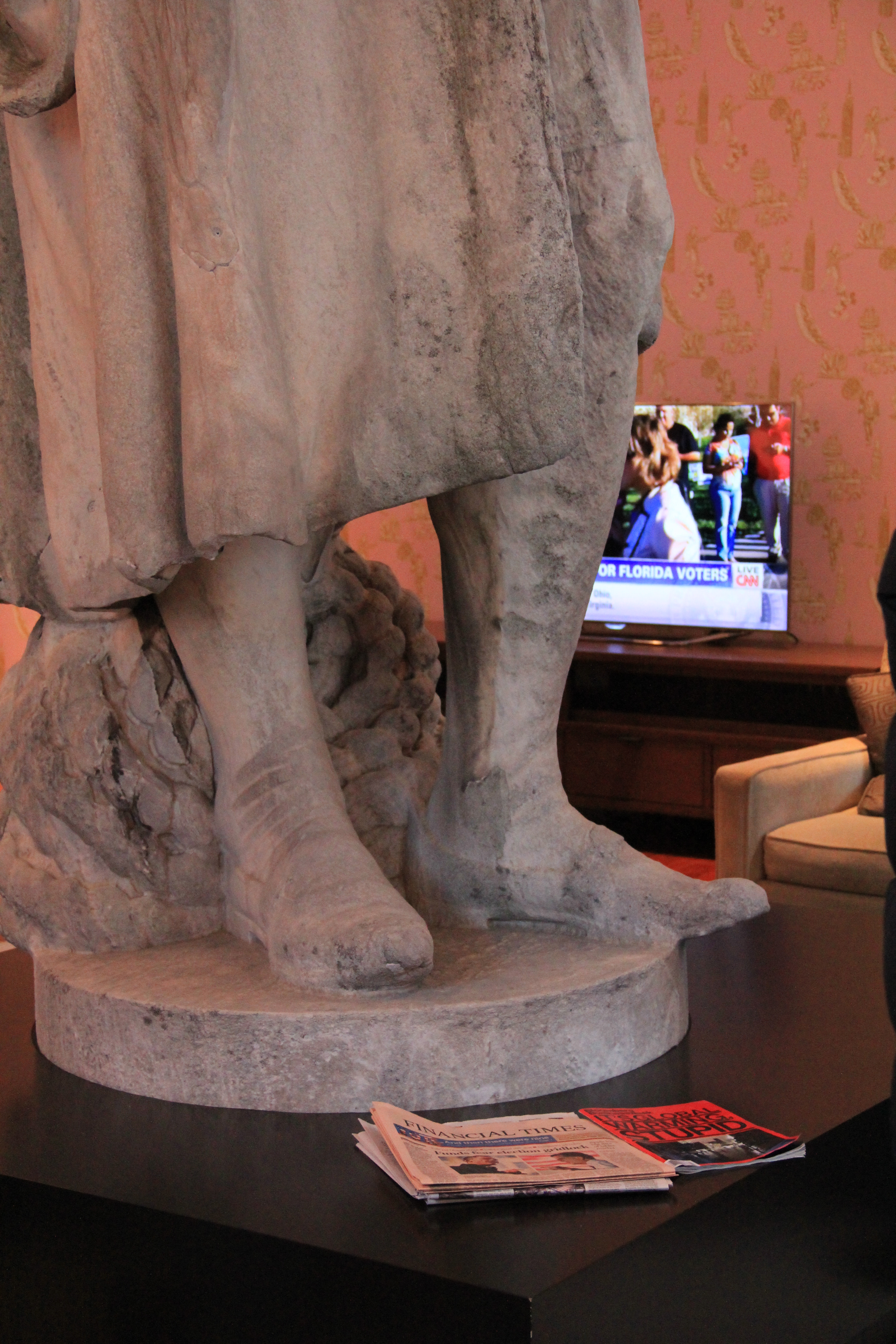 As my daughter had Election Day off, we decided a good thing to do after voting was to go see Tatzu Nishi’s Discovering Columbus, at Columbus Circle. A walk up six flights of stairs brings the viewer into an imagined modern living room for Columbus Circle’s Christopher Columbus statue complete with a large, flat screen TV and Americana-inspired pink toile wallpaper designed by Nishi. It was quite something to be at the foot of a sculpture which is normally too far off to really experience, and to “sit” with it for a while. Japanese artist Tatzu Nishi studied monuments in New York City and chose Christopher Columbus for its height, with a wish to give the viewer a new dialogue with the statue. Known for his temporary art installations which fabricate living environments around artworks and public monuments all over the world, Nishi’s Discovering Columbus is a unique gift to New York City. Free passes to visit with Mr. Columbus can be found here for just another week and a half. It’s certainly worth a view that may never be available again.