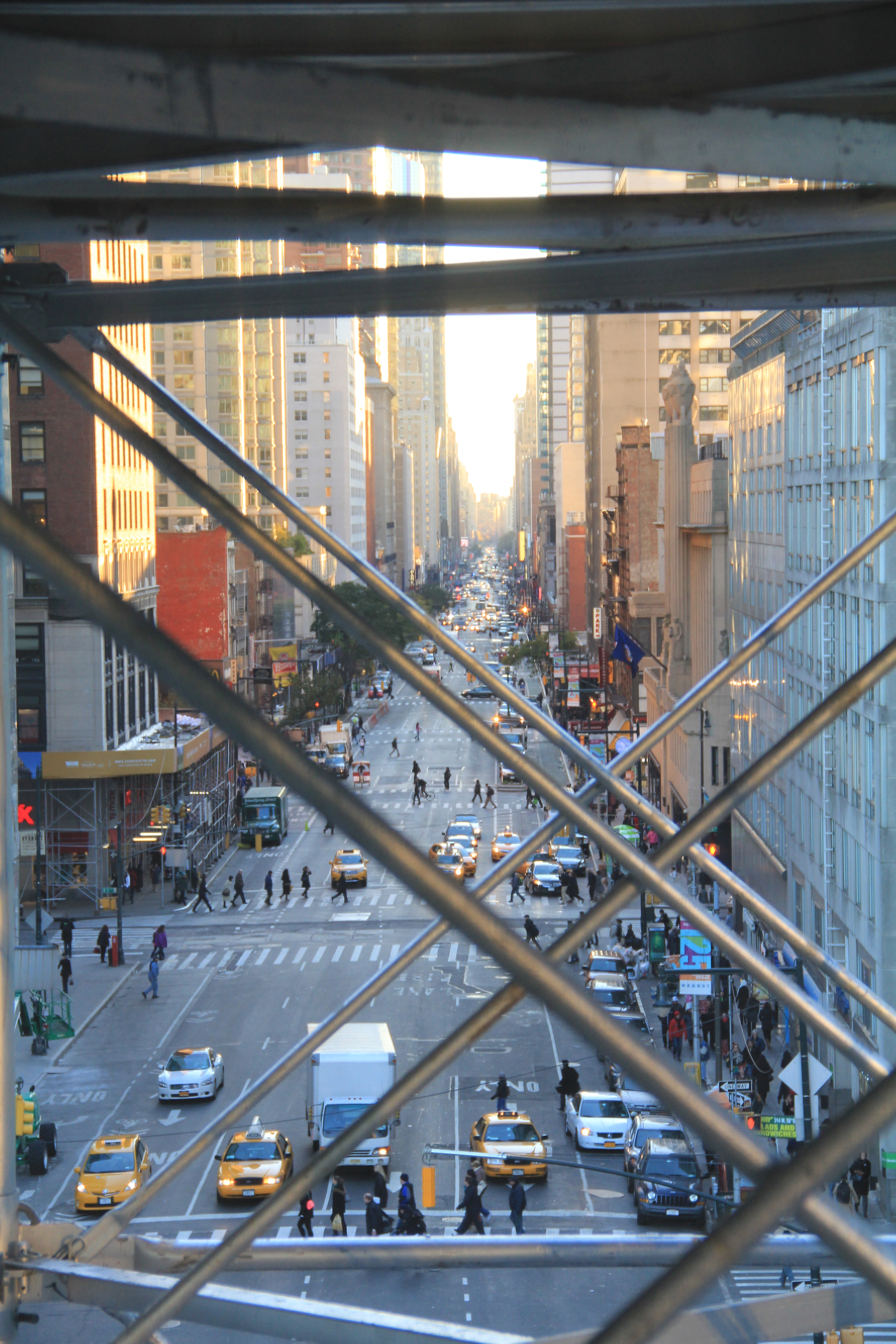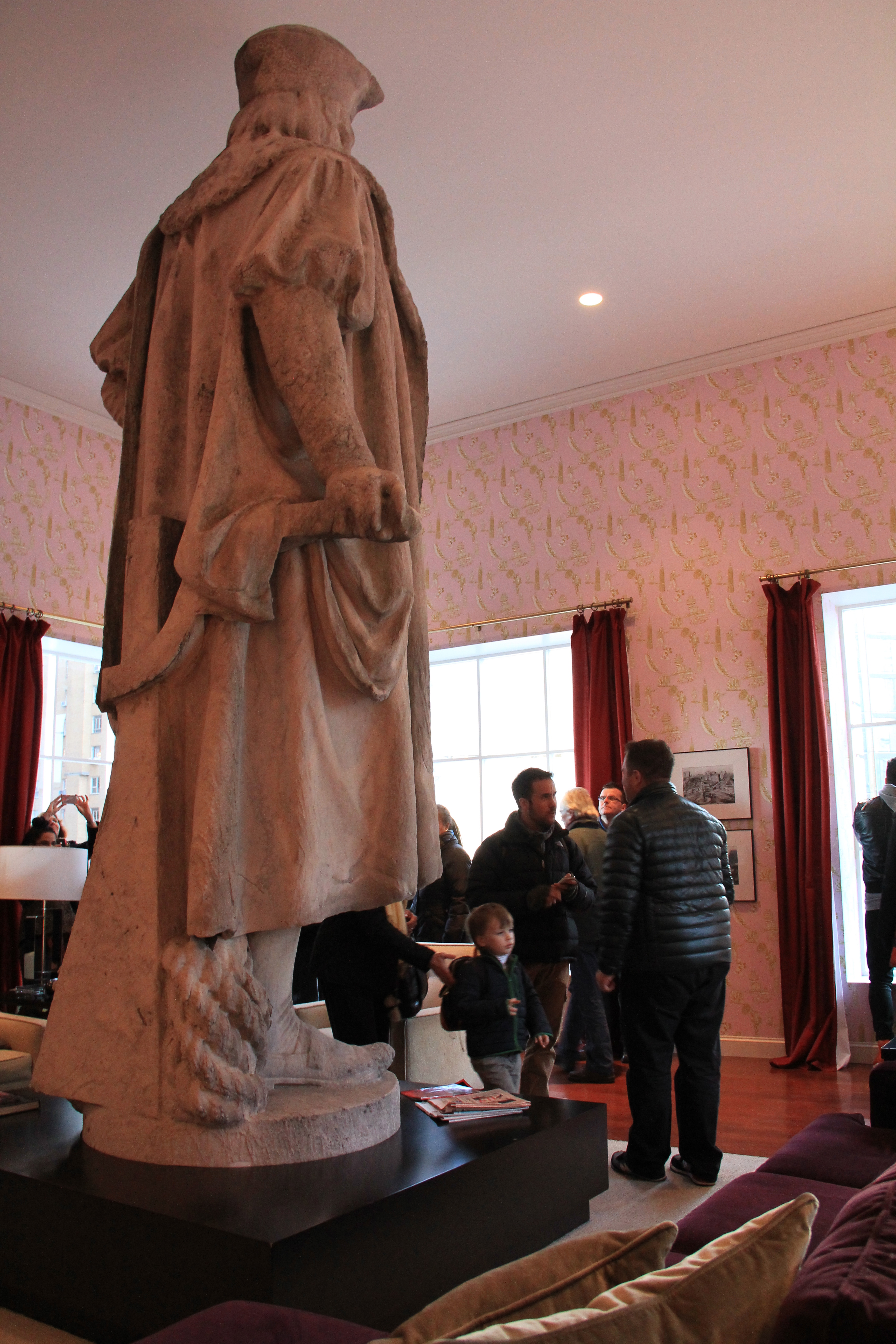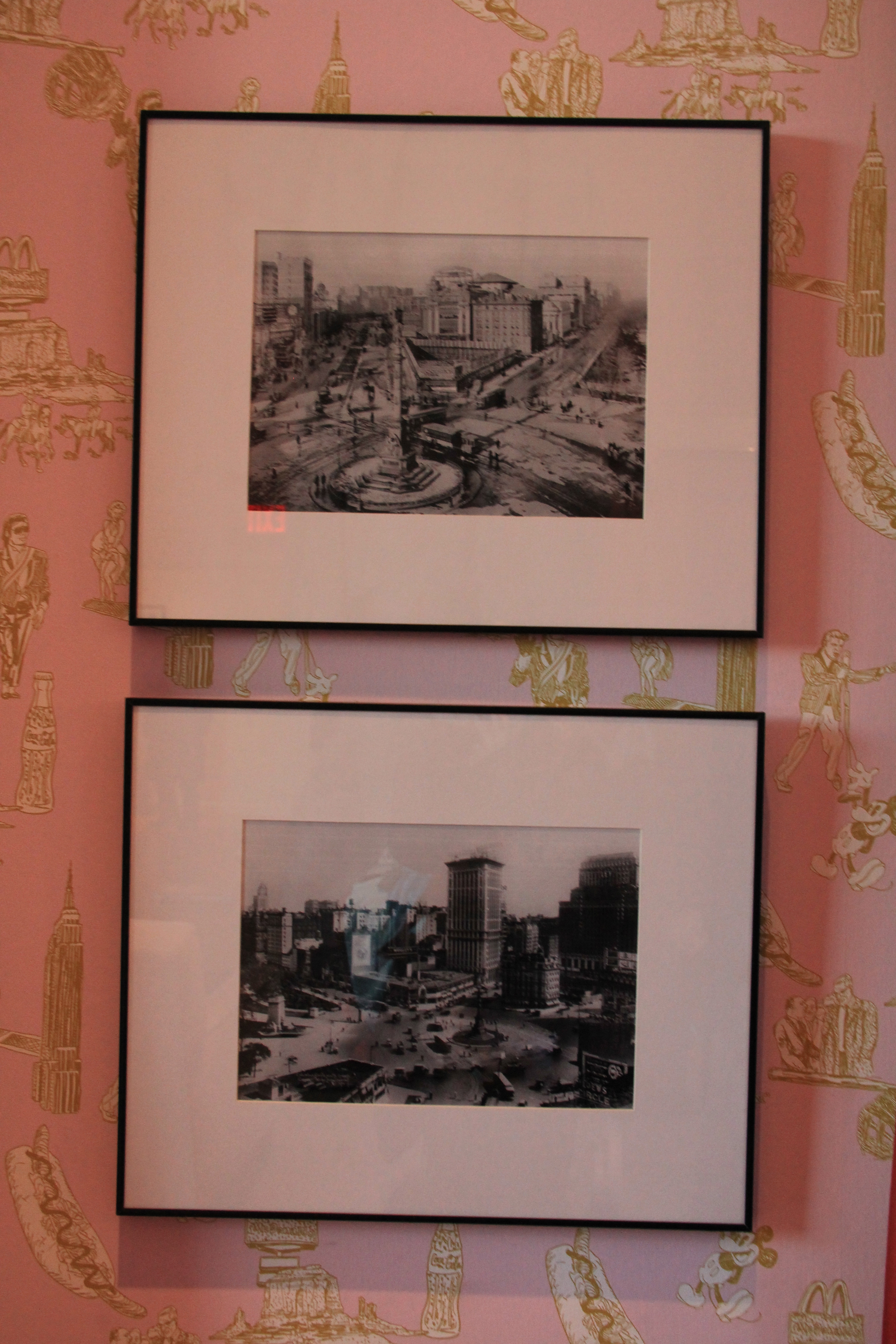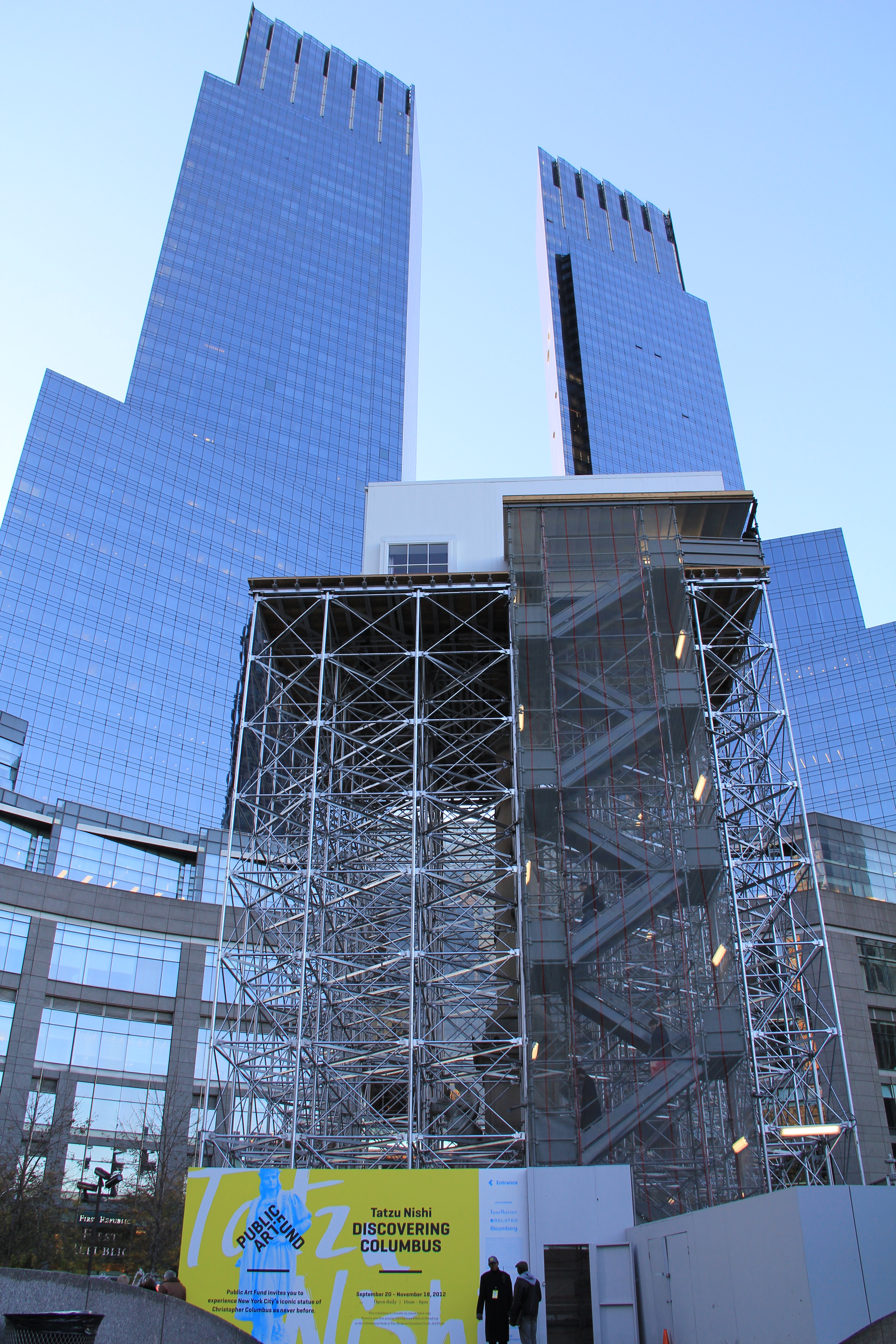 As my daughter had Election Day off, we decided a good thing to do after voting was to go see Tatzu Nishi’s Discovering Columbus, at Columbus Circle. A walk up six flights of stairs brings the viewer into an imagined modern living room for Columbus Circle’s Christopher Columbus statue complete with a large, flat screen TV and Americana-inspired pink toile wallpaper designed by Nishi. It was quite something to be at the foot of a sculpture which is normally too far off to really experience, and to “sit” with it for a while. Japanese artist Tatzu Nishi studied monuments in New York City and chose Christopher Columbus for its height, with a wish to give the viewer a new dialogue with the statue. Known for his temporary art installations which fabricate living environments around artworks and public monuments all over the world, Nishi’s Discovering Columbus is a unique gift to New York City. Free passes to visit with Mr. Columbus can be found here for just another week and a half. It’s certainly worth a view that may never be available again.