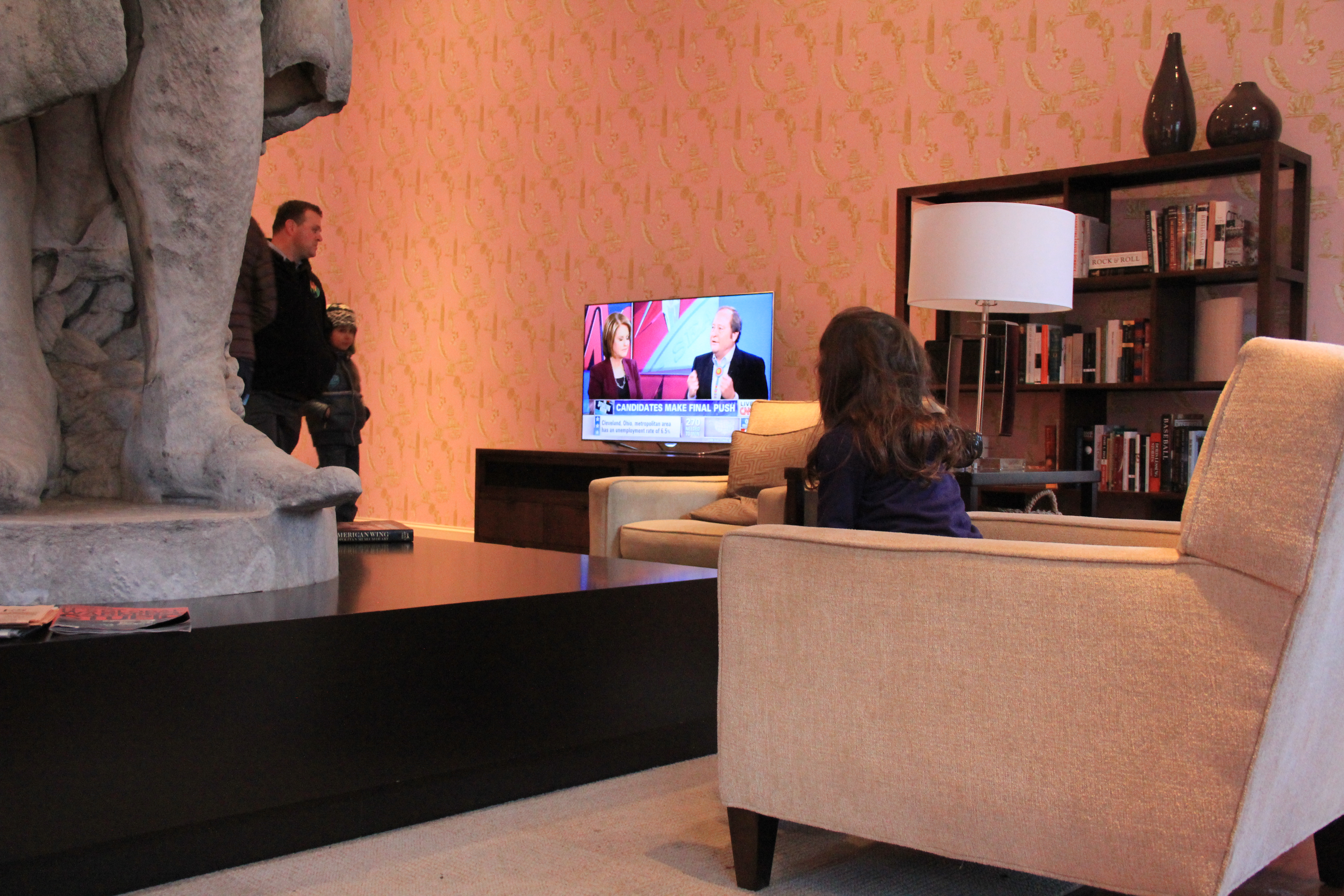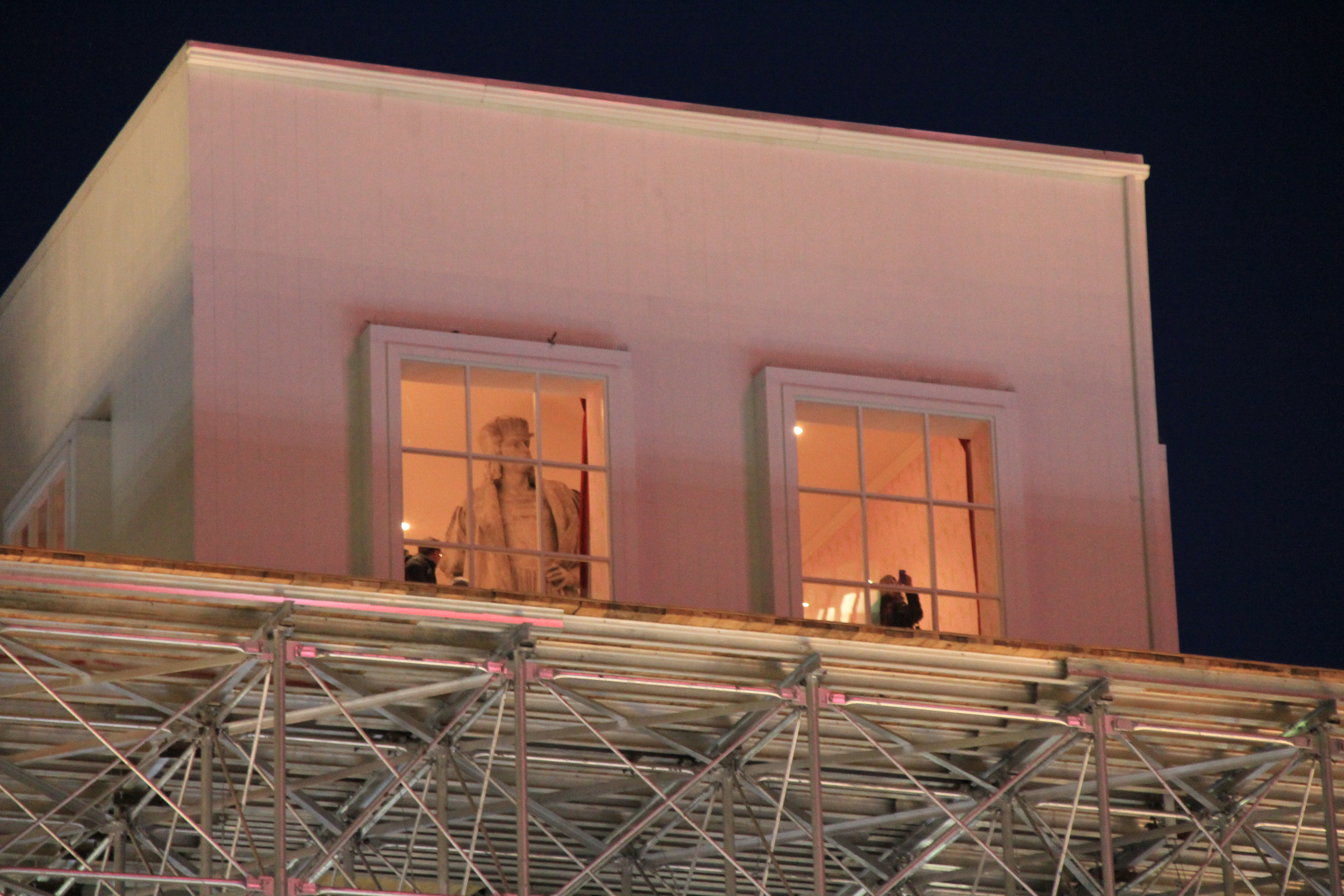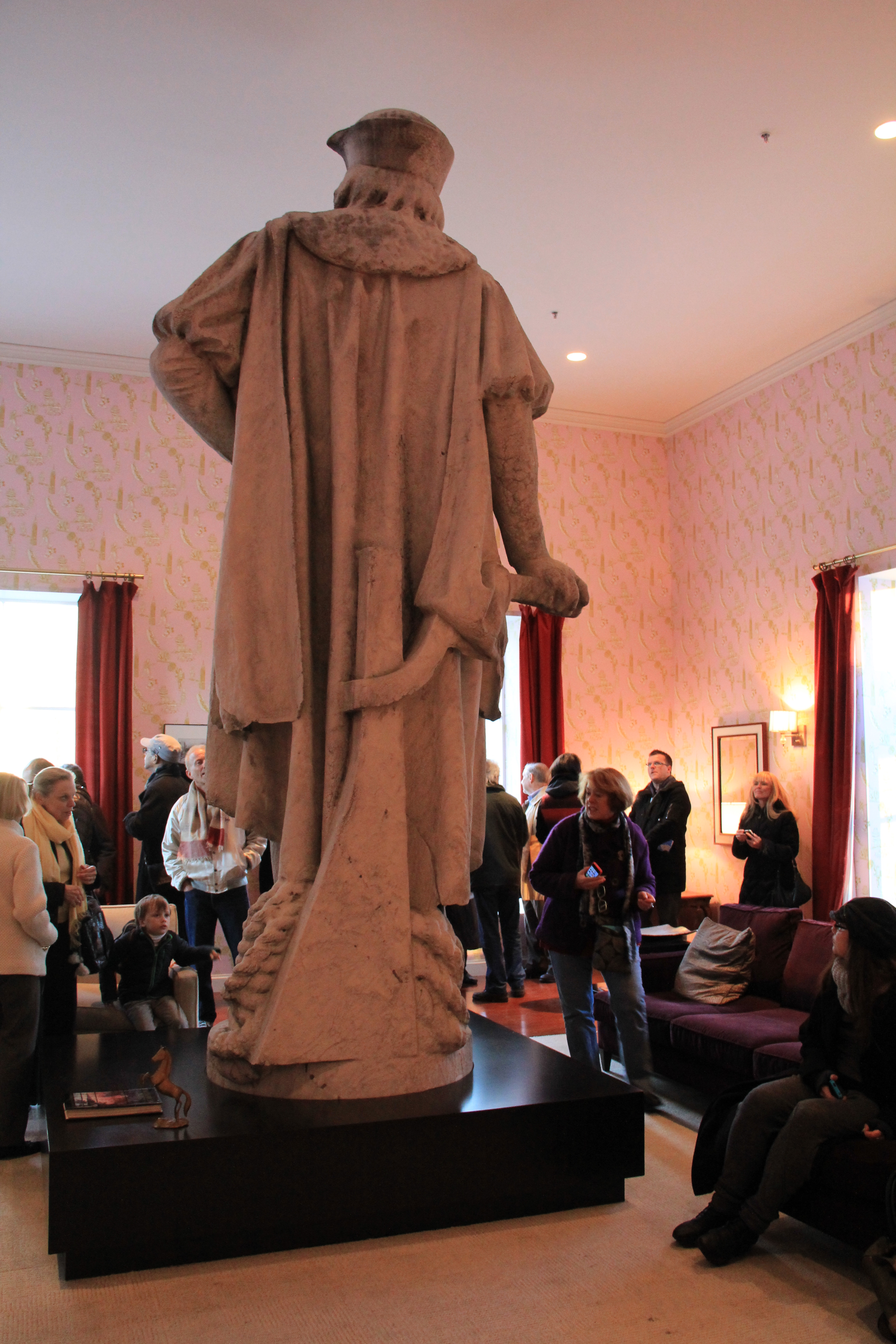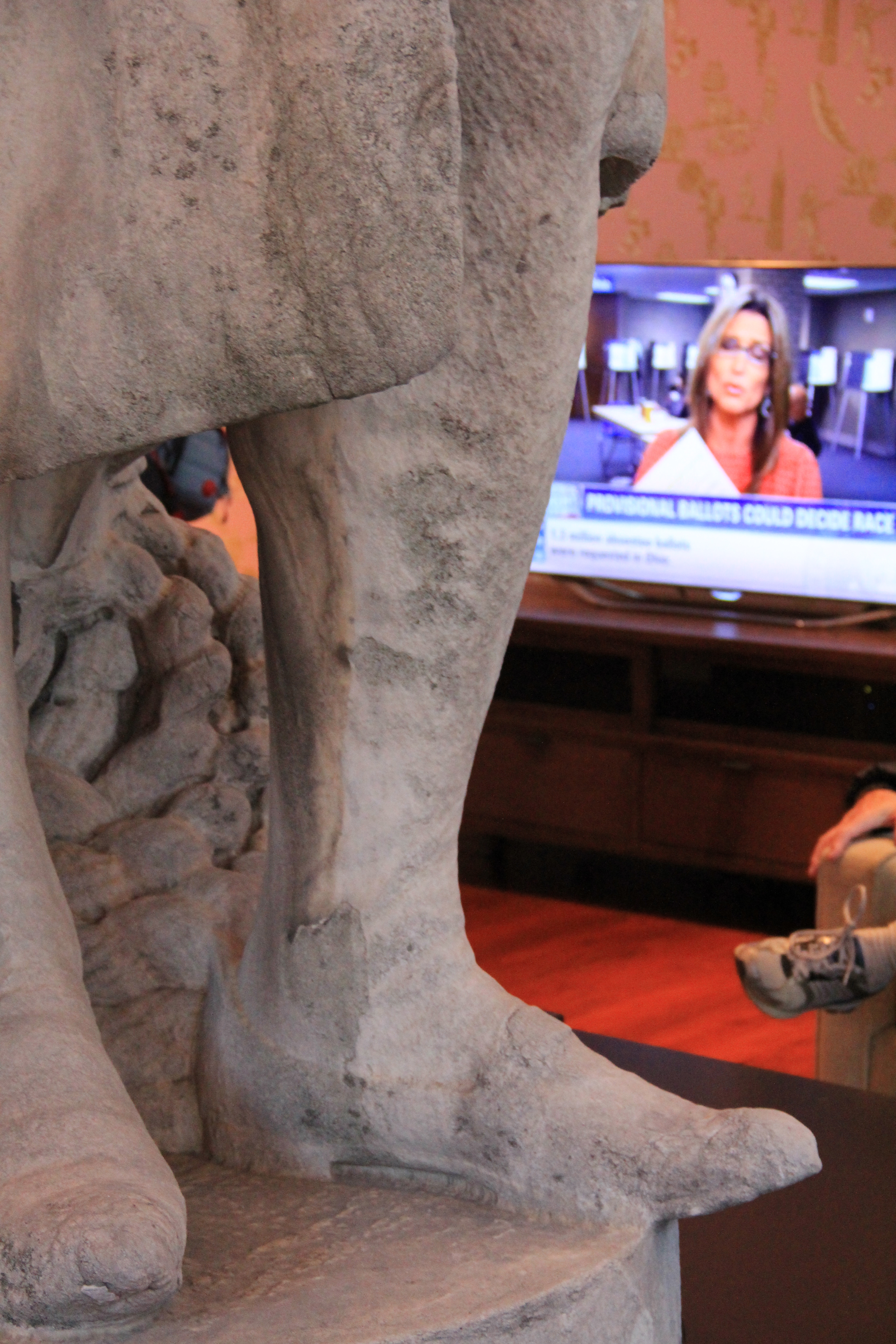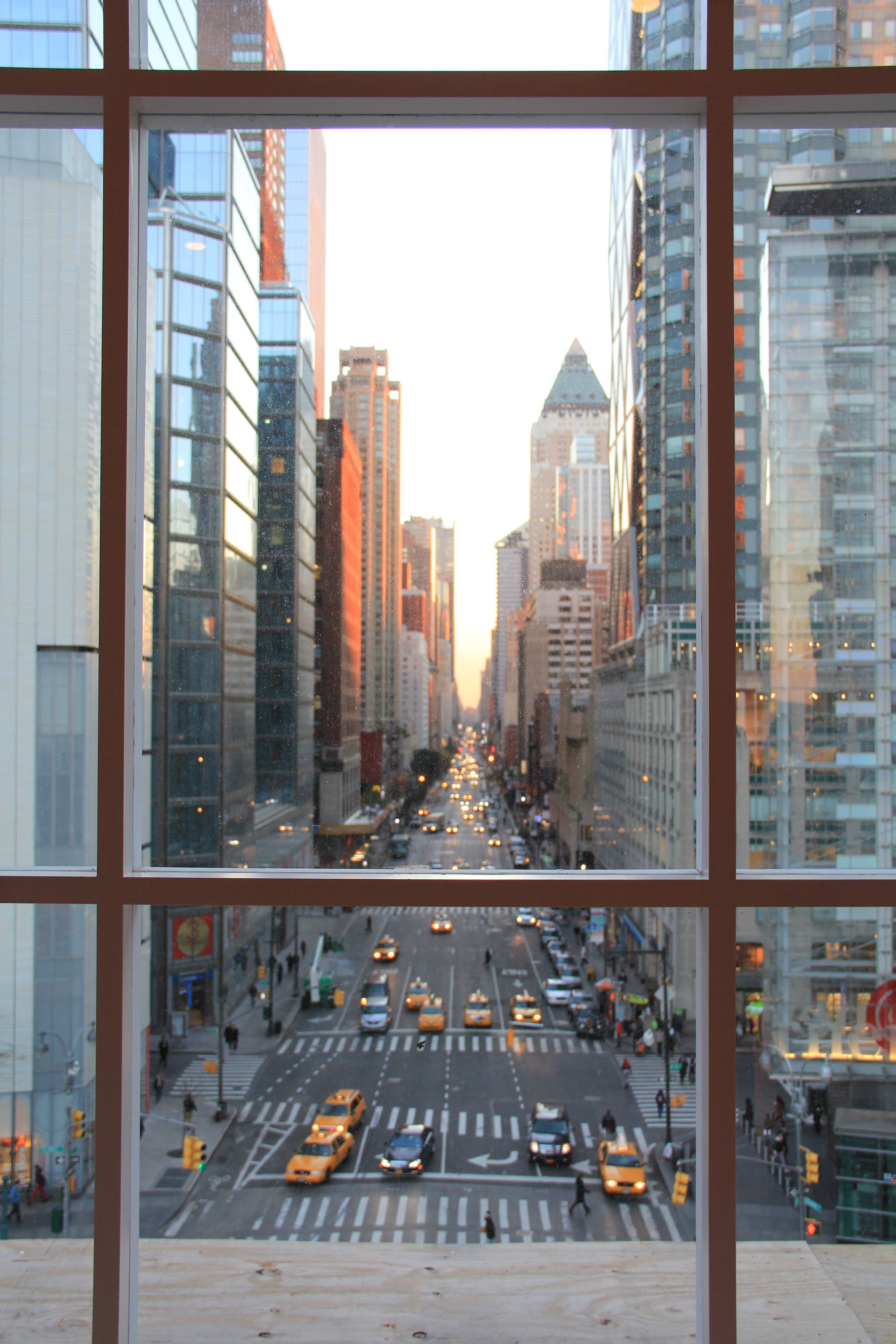As my daughter had Election Day off, we decided a good thing to do after voting was to go see Tatzu Nishi’s Discovering Columbus, at Columbus Circle. A walk up six flights of stairs brings the viewer into an imagined modern living room for Columbus Circle’s Christopher Columbus statue complete with a large, flat screen TV and Americana-inspired pink toile wallpaper designed by Nishi. It was quite something to be at the foot of a sculpture which is normally too far off to really experience, and to “sit” with it for a while. Japanese artist Tatzu Nishi studied monuments in New York City and chose Christopher Columbus for its height, with a wish to give the viewer a new dialogue with the statue. Known for his temporary art installations which fabricate living environments around artworks and public monuments all over the world, Nishi’s Discovering Columbus is a unique gift to New York City. Free passes to visit with Mr. Columbus can be found here for just another week and a half. It’s certainly worth a view that may never be available again.