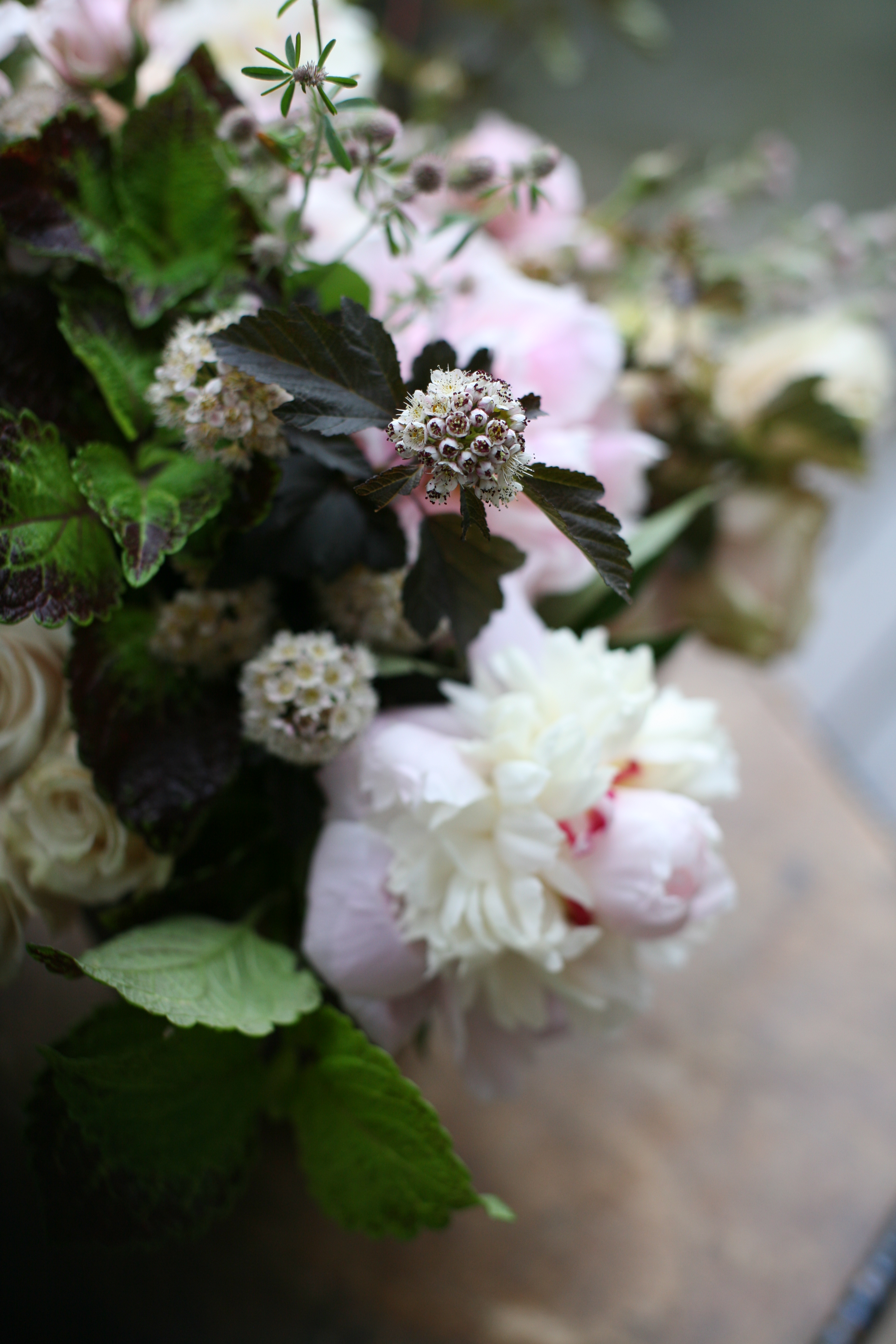 Back to the States for a second to pay homage to the glories of late Spring. I had the pleasure of playing with the flowers leftover from Lewis Miller’s most recent Master Class at FlowerSchool New York. He brought buckets and more buckets of the most sumptuous local Peonies and garden Spray Roses. He mixed those with Ninebark foliage and Coleus against a rustic earthen-color ceramic vessel. I love the contrast of dark and light, rustic and refined. The result is pure Elegance. Pure Lewis.
